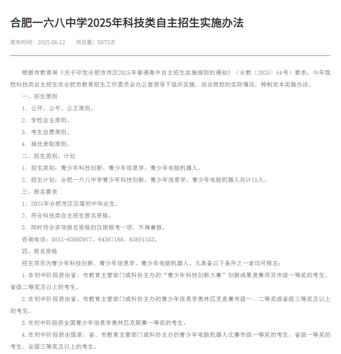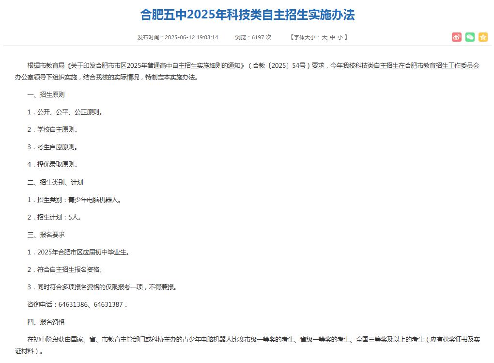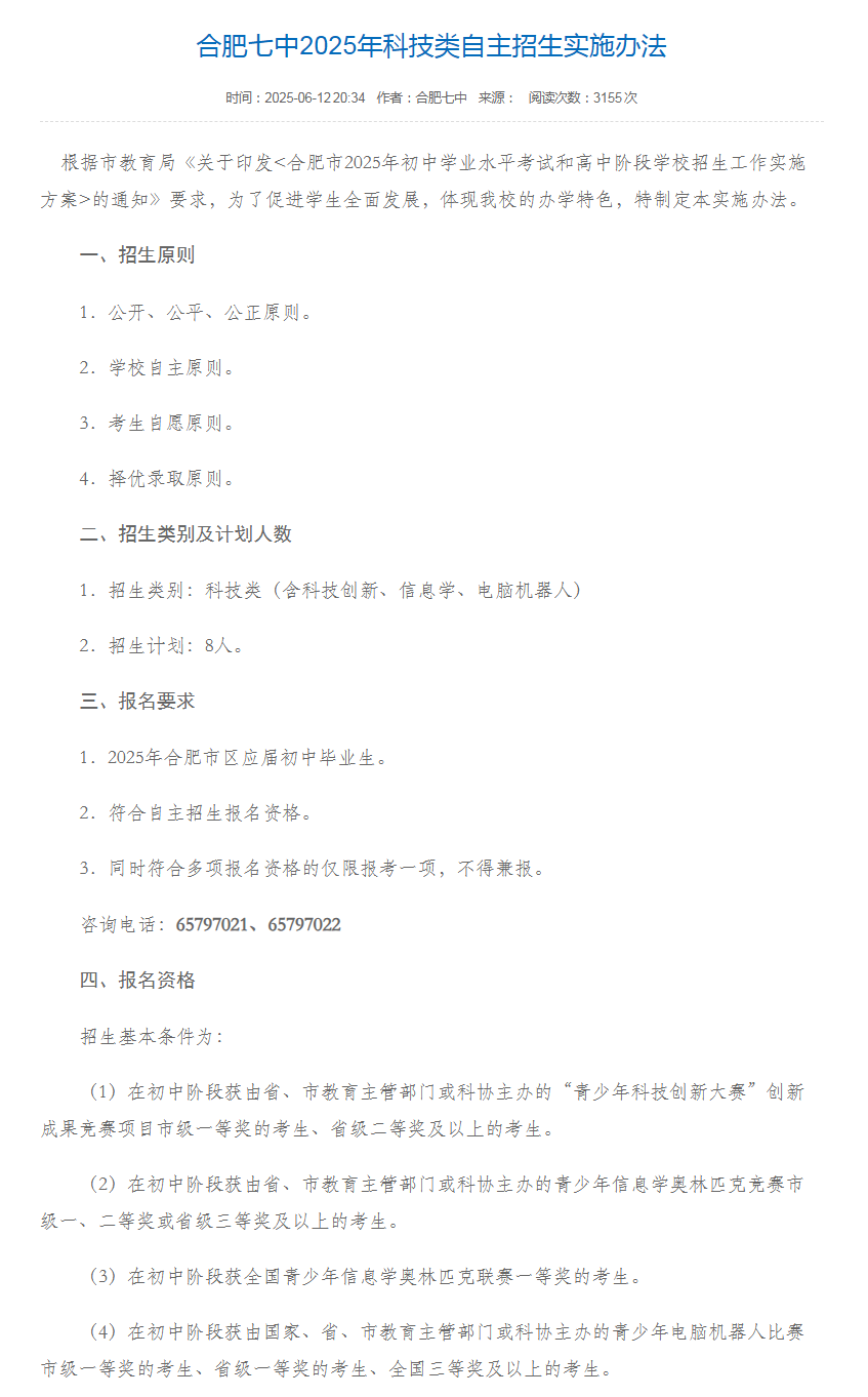 2025年合肥市市区科技特长生自主招生分数线及录取政策相关内容,感兴趣的家长可以关注,同时祝贺同源同码的学子们通过科技类特长生进入心仪学校